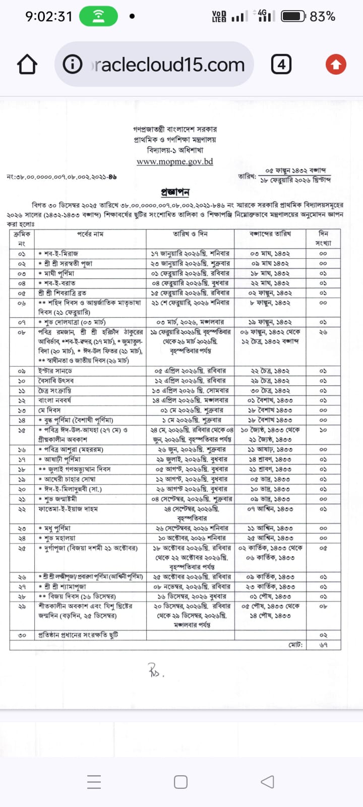 পবিত্র রমজান, শ্রী শ্রী হরিচাঁদ ঠাকুরের আভির্ভাব, শব-ই-কদর, জুমাতুল বিদা ও ঈদ-উল-ফিতর উপলক্ষে বিদ্যালয় ১৯ ফেব্রুয়ারী ২০২৬ইং রোজ বৃহস্পতিবার থেকে ২৫ মার্চ ২০২৬ ইং রোজ বৃহস্পতিবার পর্যন্ত ২৫ দিন বন্ধ থাকবে এবং ১২ই মার্চ পর্যন্ত অফিসের কার্যক্রম চলবে।শ